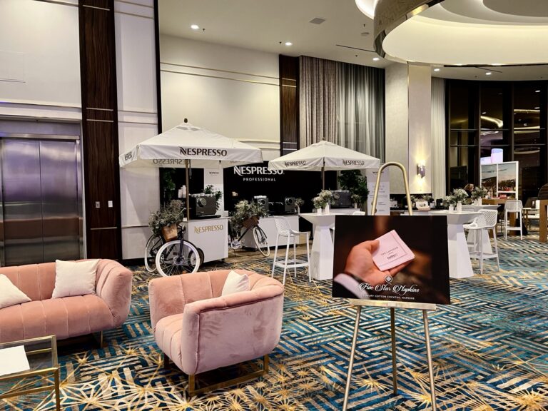 The Studio North America creates a plush seating area next to Nespresso’s brand activation at The Forbes Travel Guide Summit 2023
