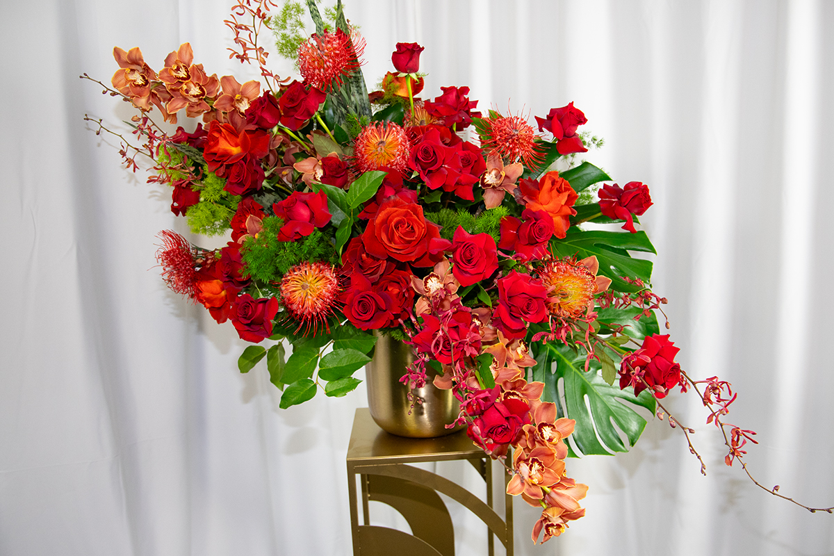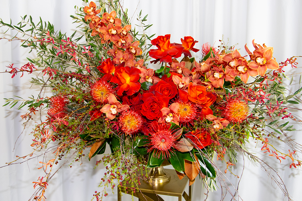 This vibrant floral arrangement showcases a stunning array of fiery hues, predominantly featuring red and orange tones. The bouquet includes striking proteas, lush roses, and elegant orchids, creating a rich texture and depth. Accents of thin, delicate branches and leafy greens add height and a natural, cascading effect. The arrangement is elegantly presented in a sleek gold stand, offering a touch of luxury and sophistication. Perfect for making a bold statement, this composition radiates warmth and energy, ideal for lively celebrations or as a captivating centerpiece.