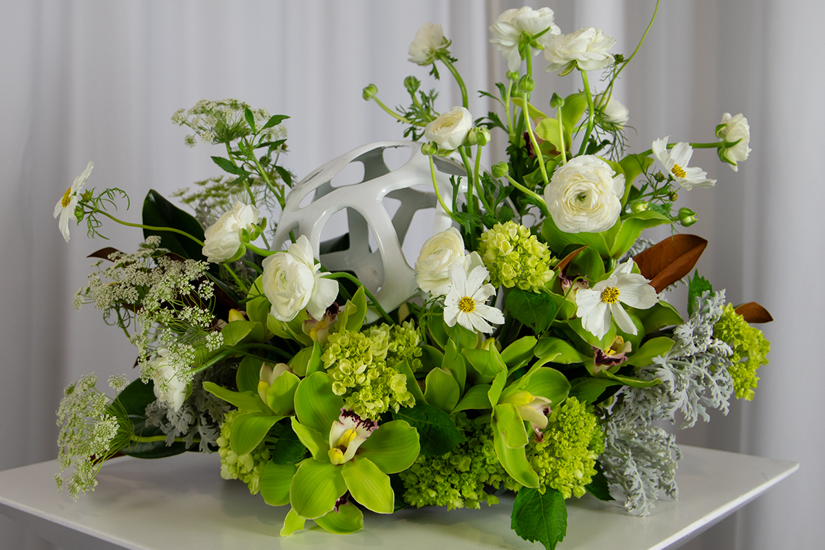 This floral arrangement is a lush and elegant display combining various green and white flowers. The bouquet features delicate white blooms, including ranunculus and cosmos, accented by vibrant green orchids. Wisps of white Queen Anne’s lace add a touch of texture, while leafy greens enhance the overall freshness. A distinctive white sculptural element is elegantly nestled among the flowers, bringing a modern and artistic flair to the arrangement.