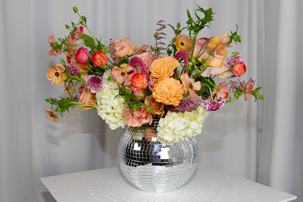 This floral arrangement features a variety of blooms, including orange roses, white hydrangeas, and pink calla lilies, along with other colorful flowers. It’s presented in a unique mirrored disco ball vase, adding a touch of modern flair. The combination of colors and textures makes it lively and elegant.