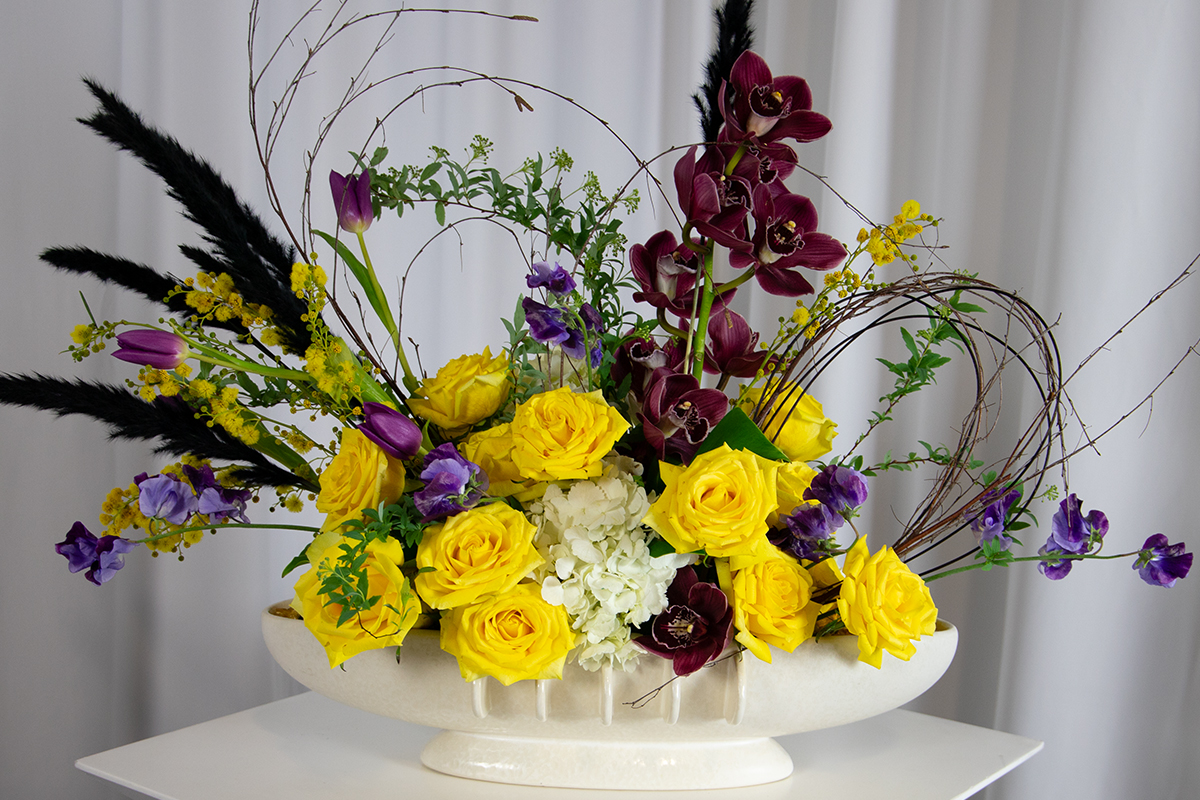 This floral arrangement showcases a beautiful contrast of colors with vibrant yellow roses, deep burgundy orchids, and purple tulips. The inclusion of green foliage and other accents adds dimension to the composition. The design features curving lines and a mix of textures, making it visually striking and dynamic.